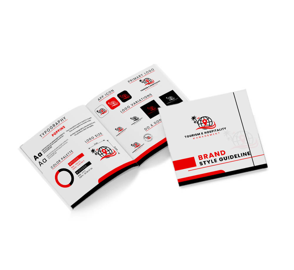 Brand guide will cover Logo Description, Logo Spacing & sizing, Typefaces/ Fonts, Color palette, Logo legibility, Logo do's and don'ts, Social media Lookups, Stationery items, Logo mockup & Contact us details.
